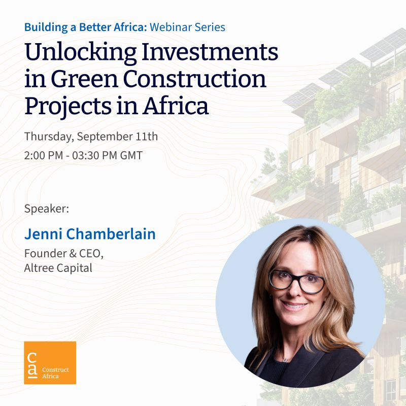 Altree Capital is pleased to share that our Founder & CEO, Jenni Chamberlain, will be joining another fantastic panel, this time with ConstructAfrica. Join Jenni, along with, Dr Nelson Ogunshakin FREng OBE, Matthew Jordan-Tank , Olubukola 'Bukky' Tokede, Bukola Odoe and Opuiyo Oforiokuma. Together, they will be doing a deep dive into one of the most critical topics for Africa's future "Unlocking Investment in Green Construction Projects in Africa".
